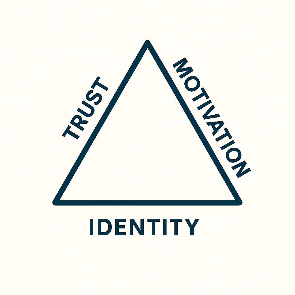 In this model, Identity forms the base—stabilizing the leader internally. From this foundation, Trust (relational security) and Motivation (directional energy) emerge. Performance, while not depicted, is treated as a byproduct of these core conditions, not a pillar of the framework itself.